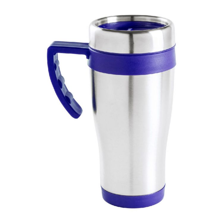 Doppelwandiger Isolierbecher aus Edelstahl mit farbigen Kunststoffteilen. Füllmenge: 450 ml. Einzeln in Geschenkbox.