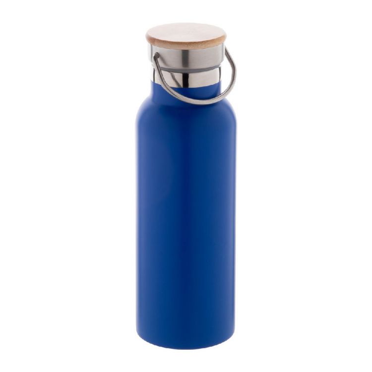 Doppelwandige, vakuumisolierte Edelstahlflasche mit Tragedeckel aus Bambus. Füllmenge: 500 ml.