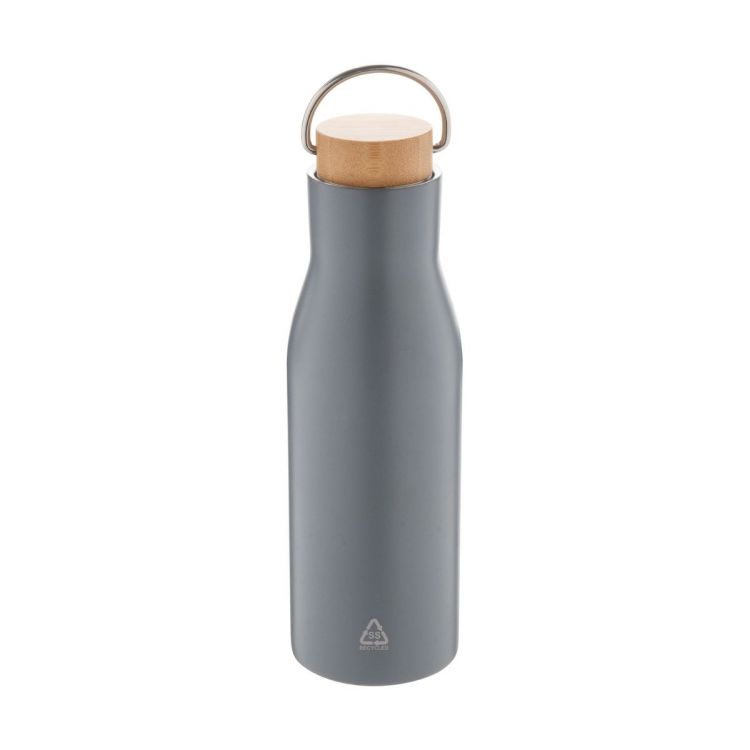 Doppelwandige, vakuumisolierte Flasche aus recyceltem Edelstahl mit Tragedeckel aus Bambus. Füllmenge: 500 ml.