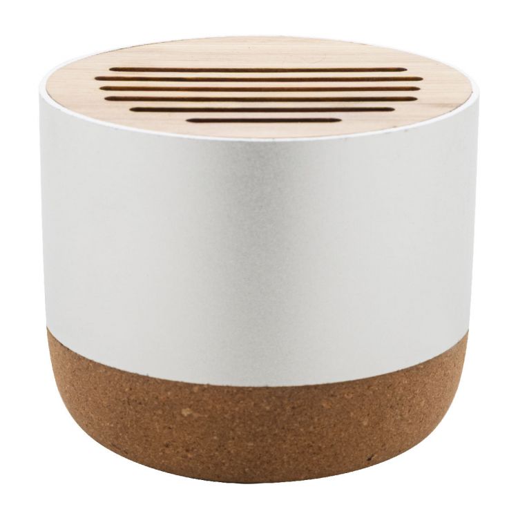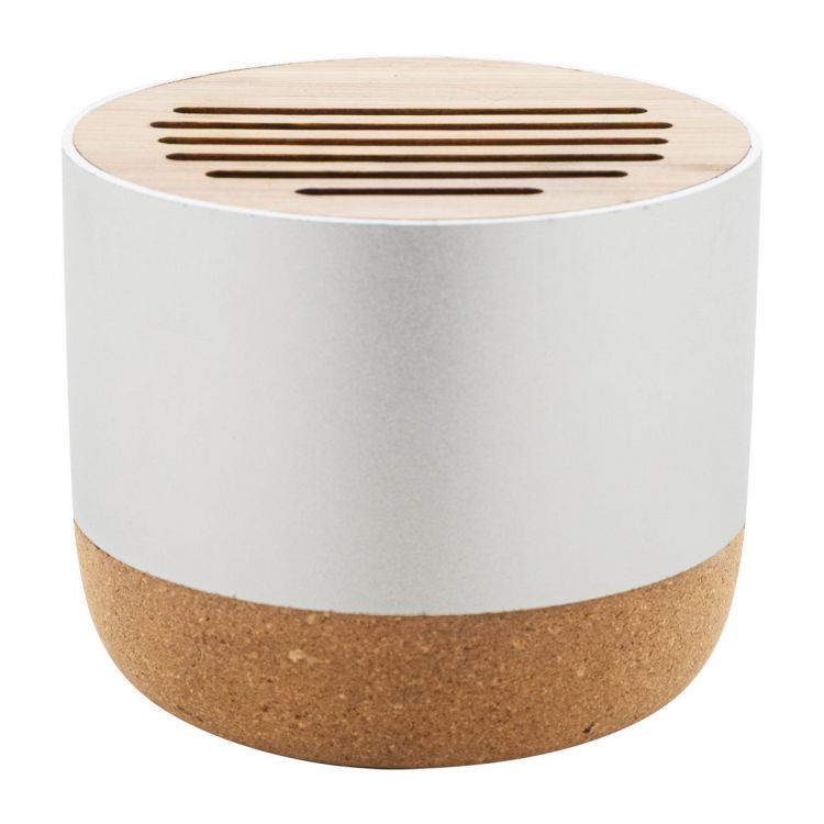 Kabelloser Lautsprecher, Gehäuse aus recyceltem Aluminium mit Bambusgitter und Sockel aus Naturkork. Mit wiederaufladbarem Akku (400 mAh). Inklusive USB-Ladekabel.