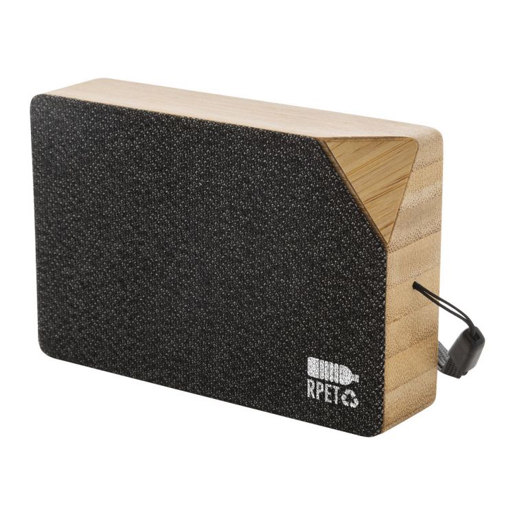 Kabelloser Lautsprecher aus Bambus mit Mesh aus RPET-Polyester, integriertem Solarladegerät, Trageschlaufe und wiederaufladbarem Akku (300 mAh). Inklusive USB-Ladekabel