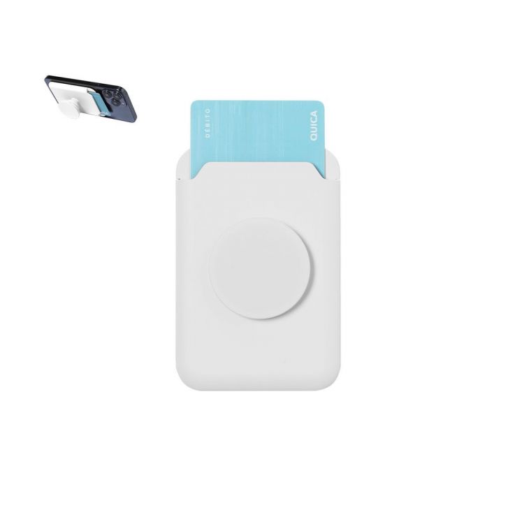 Visitenkartenetui mit klappbarem Smartphone-Halter. Entworfen, um bis zu zwei Karten aufzubewahren, enthält einen haftenden Metallring für eine sichere Befestigung und einen abnehmbaren und verstellbaren Ring für eine bessere Nutzung in glänzendem Braun.