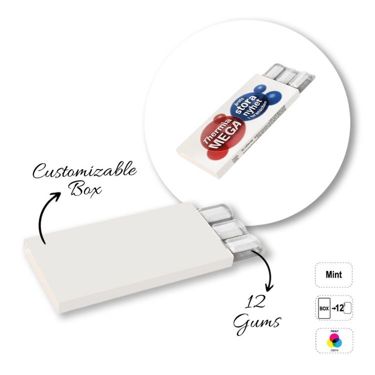 Packung mit 12 ZUCKERFREIEN Minzkaugummis. Verpackung: Kunststoffblister und vollständig anpassbare Papierbox (Papieroberfläche: Weiß oder Kraft, bei der Bestellung auszuwählen). Mindesthaltbarkeitsdatum: 12 Monate.