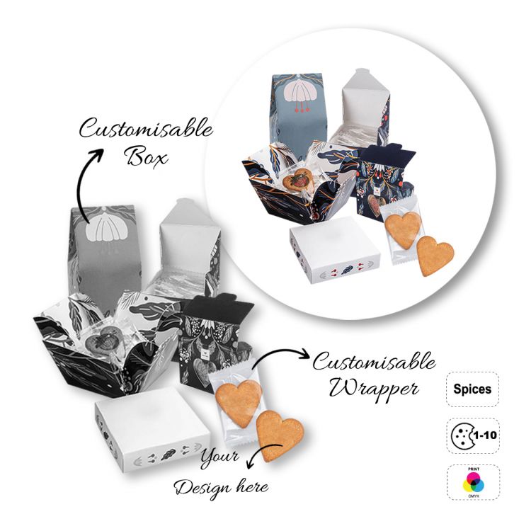 Herzförmige, gewürzte Kekse mit der Möglichkeit, die Oberfläche des Kekses individuell zu gestalten. Die Buchstaben im Produktcode entsprechen der Anzahl der Kekse in der Packung: A- 1 Keks (5,5 g), B- 3 Kekse (16,5 g), C- 6 Kekse (33 g), D- 7 Kekse (38,5 g), E- 10 Kekse (55 g). Völlig individuell gestaltbare Verpackungen: 100% kompostierbare Lebensmittelverpackungen - für die Kekse der Varianten A, B, C, D, E. 100% biologisch abbaubare Papierverpackungen - für die Kekse der Varianten B, C, D, E (Papierausführung: weiß oder Kraftpapier, bei der Bestellung zu wählen). Aufgrund ihrer Beschaffenheit können einige Kekse während des Transports zerbröckeln, was jedoch weder ihre Qualität noch ihren Geschmack beeinträchtigt. Mindesthaltbarkeit: 6 Monate.