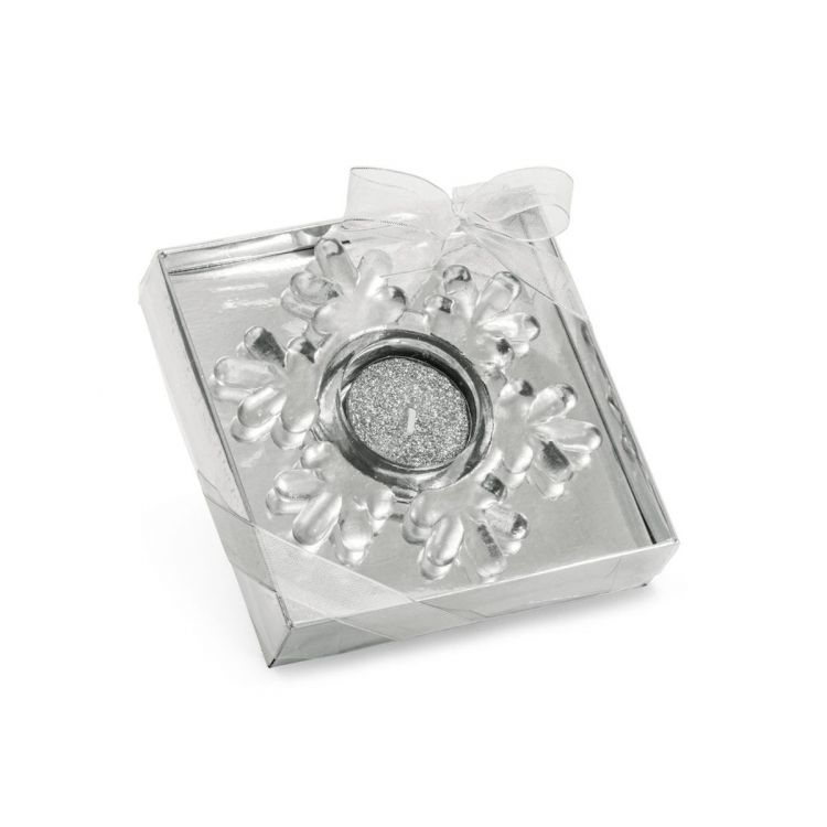 Kerze in Glasbehälter. Form: Schneeflocke. Geliefert in einer Gechenkschachtel, in silber farbe