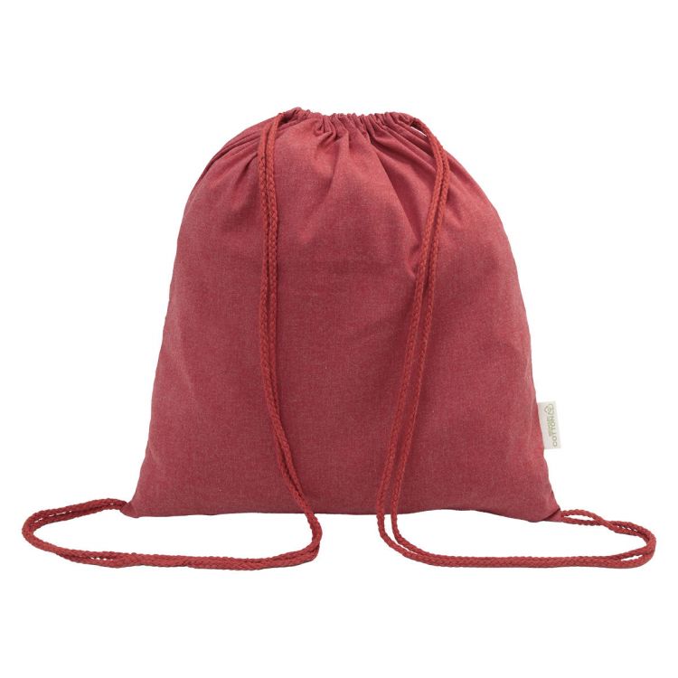 Kordelzugbeutel aus 70 % recycelter Baumwolle und 30 % RPET-Polyester, 140 g/m². Mit Label recycelte Baumwolle.
