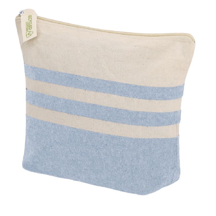 Toilettentasche, hauptsächlich aus recycelter Baumwolle gefertigt, 180 g/m², in einem eleganten Naturton mit horizontalem gestreiftem Design. Hauptfach mit Reißverschluss. Enthält Außenetikett mit Logo für recycelte Baumwolle.