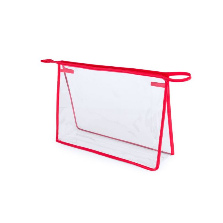 Vielseitig verwendbare Tasche aus robustem, transparentem PVC mit Paspel in lebendigen Farben. Mit Reißverschluss und farblich passendem Tragegriff. (rot farbe)