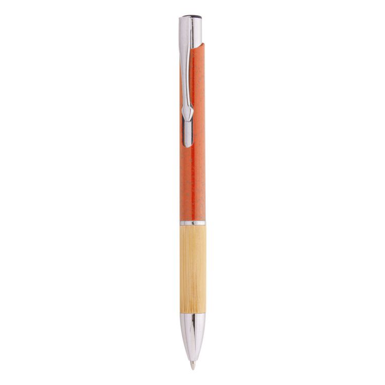 Kugelschreiber aus ökologischem Weizenstrohkunststoff mit Bambus-Griffzone und Elementen aus Metall, blauschreibend.