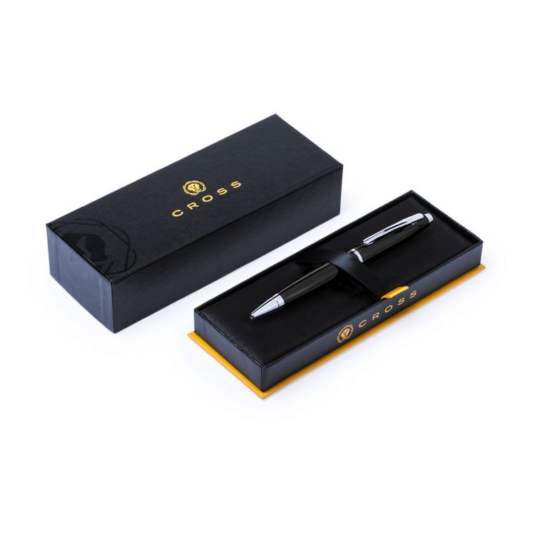 Druck-Kugelschreiber von Cross - Modell Calais. Mit elegantem, zweifarbigem Design und geschmeidigem Metallgehäuse in verschiedenen Farben. Präsentiert in einer individuellen, eleganten Schachtel in Schwarz mit dem Markenlogo, sowie Wildleder-Interieur in passender Farbe. Schwarze Tinte.