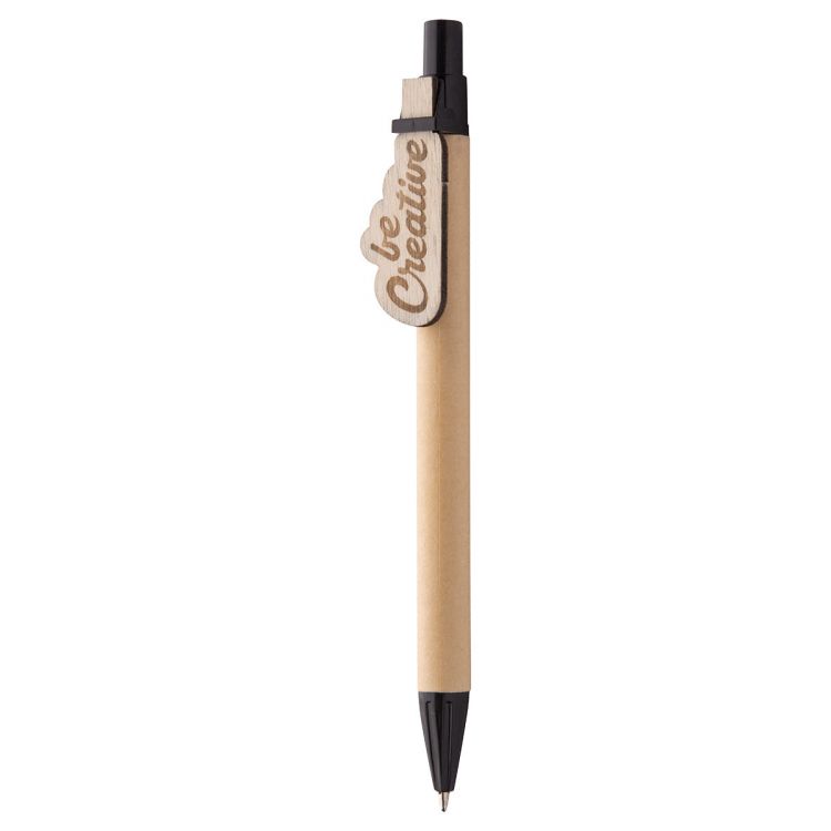 Kugelschreiber aus recyceltem Papier mit individuell gefertigtem Clip aus Sperrholz und blauer Mine. Der Clip wird in einer individuellen Form gefertigt – maximale Größe: 25×35 mm. Der Preis beinhaltet eine Logo-Gravur auf dem Clip. Mindestmenge: 100 Stück, in schwarz farbe