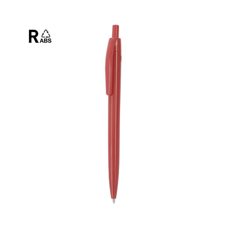 Kugelschreiber aus RABS. Druckmechanismus und blauer Tinte. RABS-Merkmal auf der Oberseite des Kugelschreibers.RABS ist ein hochgradig recycelbarer Kunststoff mit hoher Widerstandsfähigkeit und zahlreichen Anwendungen die ihn zu einer umweltfreundlichen Lösung machen.