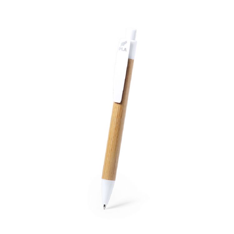 Nature Line Kugelschreiber mit Druckknopfmechanik. Kombination aus glänzendem Bambuskörper und Zubehör aus PLA -Poly Milchsäure-, die aus 100% natürlichen Ressourcen wie Maisstärke, Maniok oder Zuckerrohr gewonnen wird und am Ende ihres Lebenszyklus zu 100% kompostierbar ist. Clip mit großer Beschriftungsfläche und in vielen Farben erhältlich, mit blauer Tinte. PLA-Plakette am oberen Teil des Clips.