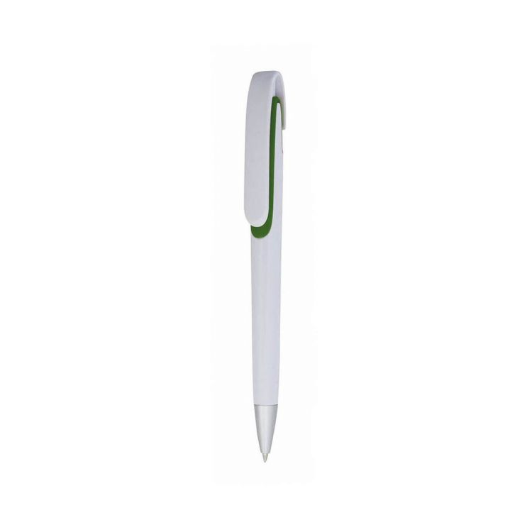 Druck-Kugelschreiber mit auffälligem dreifarbigem Design und Kontrastdetails in lebendigen Farben. Mit glattem Schaft in Weiß und originellem, farblich passendem, gebogenem Clip sowie komfortablem Griff. Blaue Tinte.