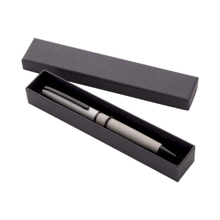 Eleganter Drehkugelschreiber aus Metall mit Schaft aus PU-Leder und schwarzen Teilen. In schwarzer Geschenkbox. Mit blauschreibender Mine.