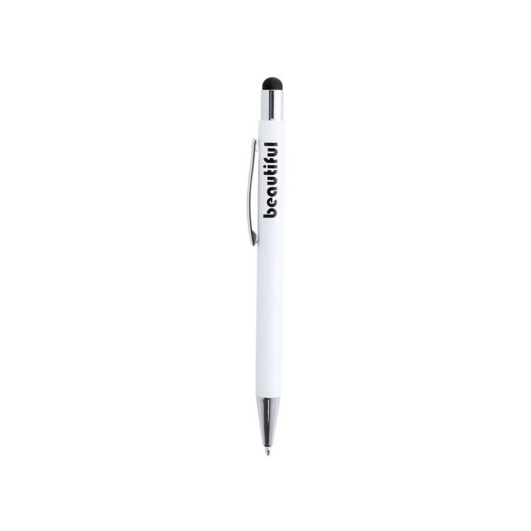 Druck-Kugelschreiber mit Stylus aus Aluminium in einem eleganten, matten Weiß. Mit Stylus in einer Vielzahl von Farben - farblich passend zum Interieur - und verchromten Kontrastdetails. Mit Außenbeschichtung, die speziell für die Lasermarkierung entwickelt wurde, so dass Ihr Logo in der Farbe des Interieurs graviert wird. Jumbo-Patrone mit blauer Tinte.