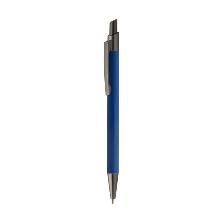 Kugelschreiber aus recyceltem Aluminium mit gummierter Oberfläche und Elementen in Gunmetal-Optik. Blauschreibend.