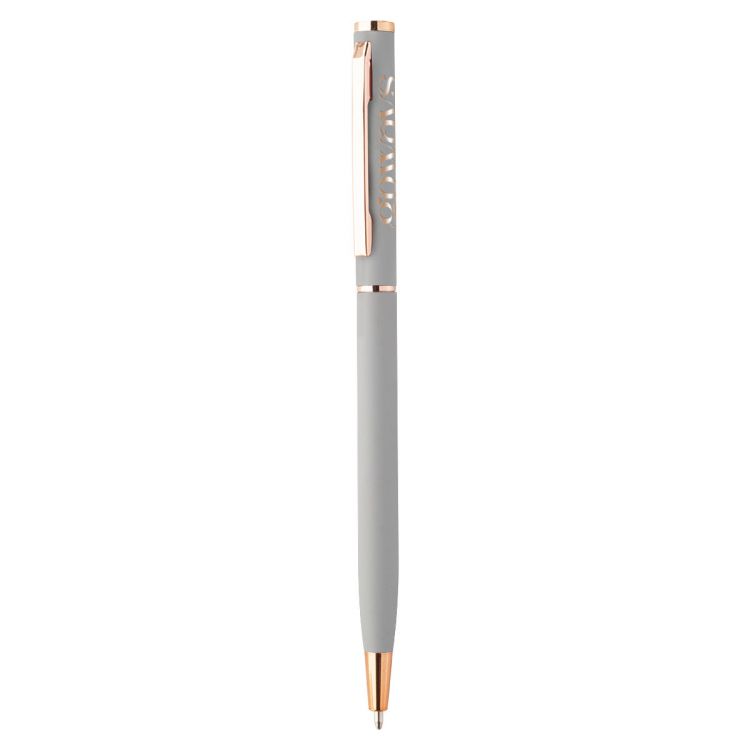 Drehkugelschreiber aus recyceltem Aluminium mit gummierter Oberfläche und rosagoldenen Elementen. Mit Spezialbeschichtung für rosagoldenfarbene Spiegelgravuren. Blauschreibend.