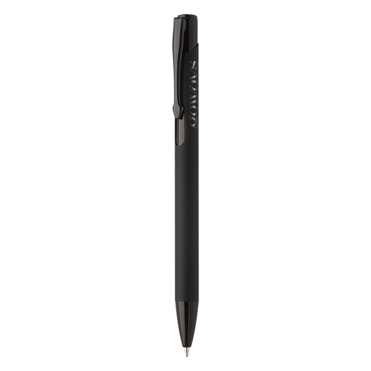 Kugelschreiber aus recyceltem Aluminium mit gummiertem Gehäuse und farbig glänzenden Metallteilen, blauschreibend. Mit Spezialbeschichtung für Spiegelgravur passend zu den Metallteilen.