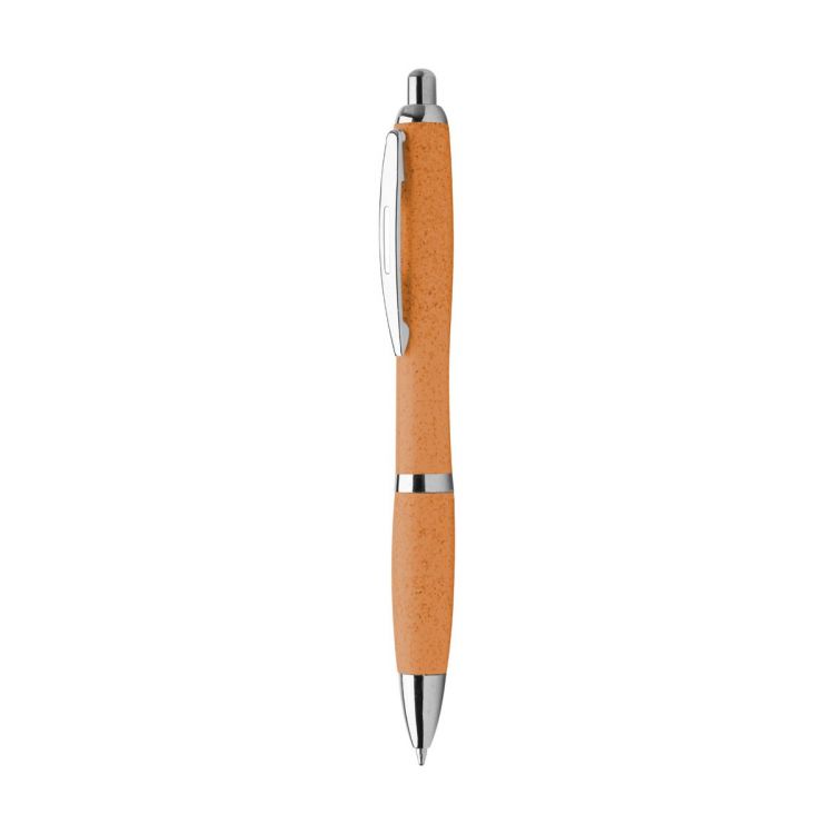 Kugelschreiber aus Recyclingpapier mit Teilen aus Weizenstroh-Kunststoff und verchromten Elementen, blauschreibend.