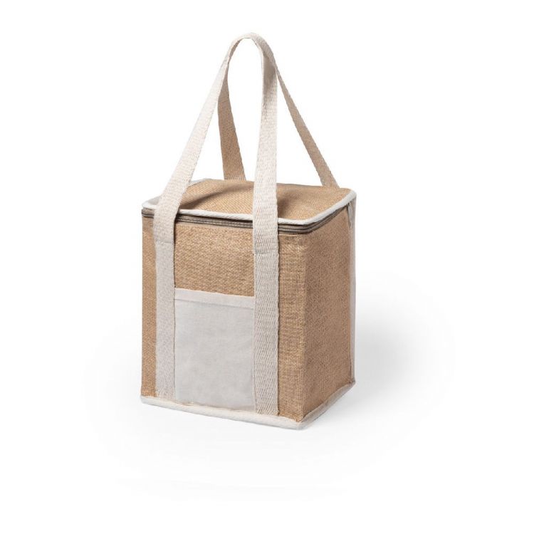 Reißverschluss-Kühltasche aus laminierter Jute und Baumwolle mit Aluminiumbeschichtung. Mit Vordertasche, ideal für die Bedruckung