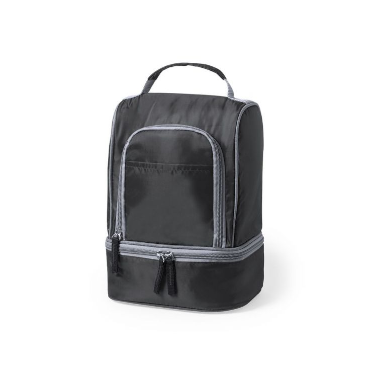 Vielseitig verwendbare Kühltasche aus 210D Polyester in lebendigen Farben. Mit zwei separaten Reißverschlussfächern und Fronttaschen - eine davon mit Reißverschluss - sowie Isotherm-Innenraum in PEVA-Ausführung. Praktischer verstärkter Tragegriff in passender Farbe.