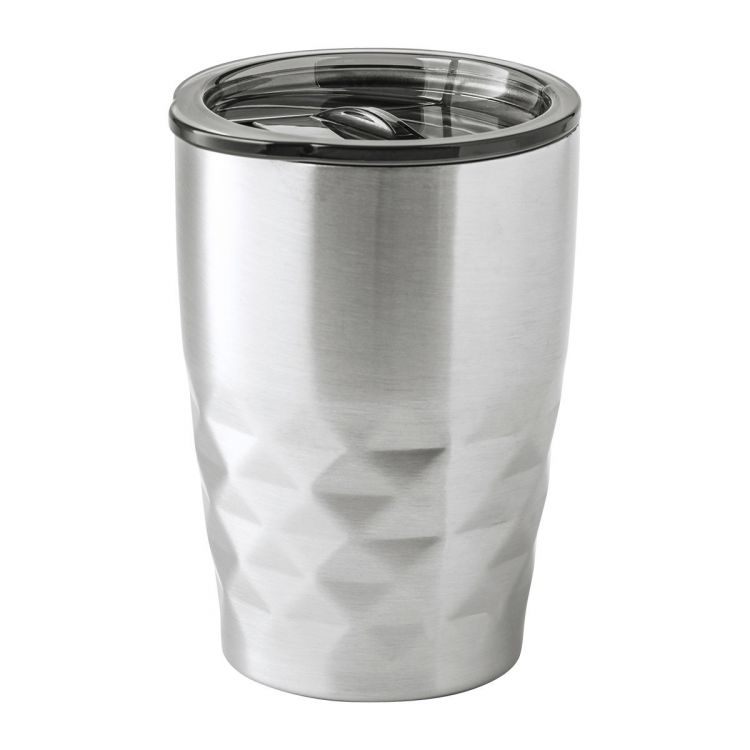 Doppelwandiger, vakuumisolierter Thermobecher aus Edelstahl und Kupfer mit Trinkdeckel aus Kunststoff. Füllmenge: 350 ml. Die Kupferisolierung hält Getränke ca. 12 Stunden lang heiß und ca. 24 Stunden lang kühl.