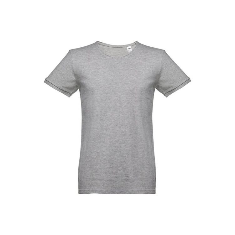 Herren T-shirt aus Piqué Stoff 100% gekämmte Baumwolle (195g/m²) in Tubular-Form, mit dünnem 1x1 Ripp am Kragen und an den Ärmeln. Mit Verstärkungsband am Kragen, ohne Etikett. Bei der Farbe 183 bestehend aus 85% Baumwolle und 15% Viskose, in hellgraue meliert farbe