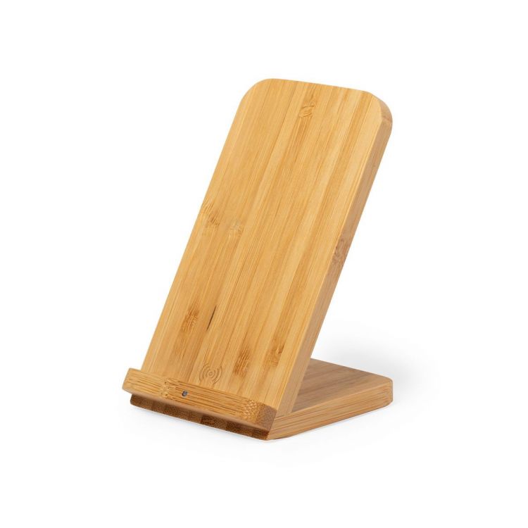 Naturlinie, kabelloses Ladegerät mit Smartphone-Halterungsfunktionalität. Hergestellt aus Bambus, aus natürlich geschnittenen Bambusstücken. Ladeanzeige und kompatibel mit Geräten, die mit drahtloser Ladetechnologie ausgestattet sind. Großer Druckbereich und präsentiert in einer attraktiven, individuellen Öko-Design-Box. (natürlich farbe)