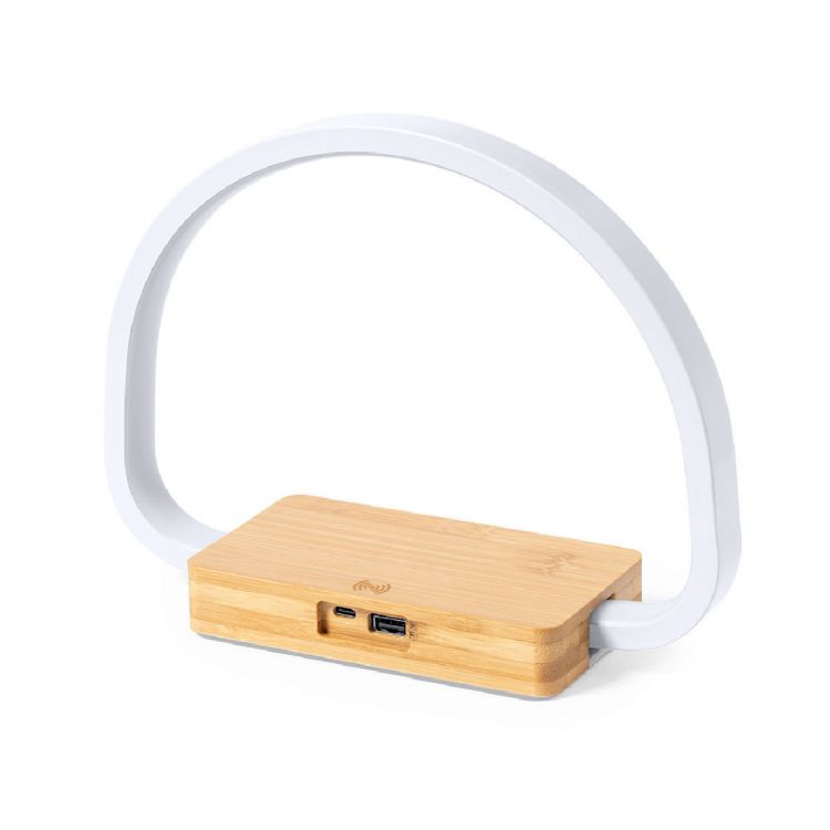 Öko-Design Ladelampe. Hergestellt aus Bambus aus natürlichen Stecklingen und mit rutschfestem Fuß. Integriertes kabelloses 10W-Ladegerät. Enthält 52 LEDs und 3 Leuchtstufen (warm, kalt und mittel) mit einstellbarer Lichtintensität. Kompatibel mit mobilen Geräten mit kabellosem Ladegerät und USB-Anschluss. Inklusive Typ-C-Ladekabel und in attraktiver Öko-Design-Verpackung. Gebrauchsanweisung in Spanisch und Englisch erhältlich. (natürlich farbe)