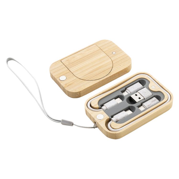 USB-Ladekabelset und Wireless-Fast-Charger (15W) aus ökologischem Weizenstroh-Kunststoff in magnetischem Bambusetui mit Trageschlaufe. Inkl. USB-C-Kabel mit USB-, Micro-USB- und Lightning-Adapter
