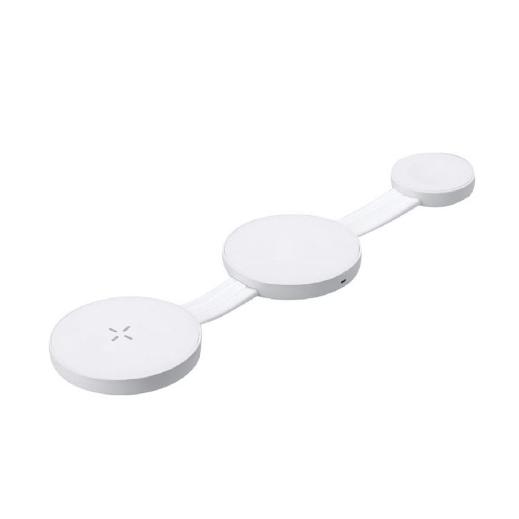3-in-1 15W magnetisches kabelloses Ladegerät, gefertigt aus ABS. Konzipiert für das gleichzeitige Laden von Smartphones, Kopfhörern und Smartwatch und ultrakompakt in der Größe. Ein All-in-One-Gerät: faltbar, tragbar, äußerst vielseitig und funktional gestaltet. USB-Typ-C-Anschluss – inklusive Kabel –.
