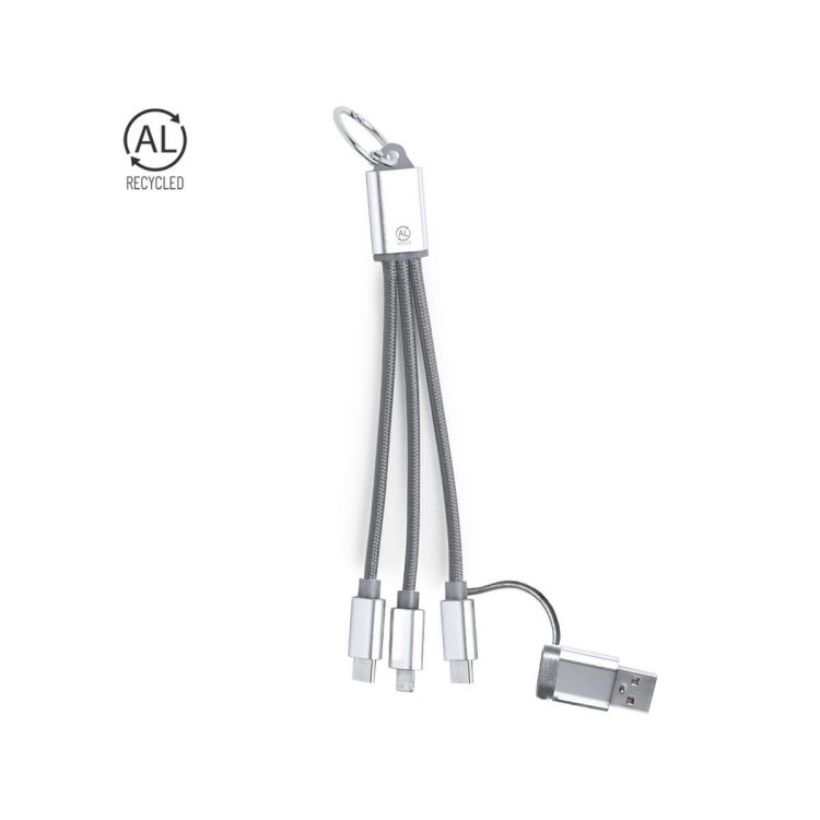 Ladekabel aus recyceltem Aluminium. Mit dualem Typ-C/USB-Eingang und Ausgängen Typ-C, Lightning und Micro-USB. Enthält ein Zeichen für recyceltes Aluminium.Recyceltes Aluminium ist ein Material mit nahezu unendlichen Recyclingmöglichkeiten, ohne dabei seine ursprünglichen Eigenschaften zu verlieren und weniger Energie in diesem Prozess zu verbrauchen.GRS-Zertifizierung (Global Recycled Standard), die die recycelte Herkunft des für die Herstellung des Produkts verwendeten Materials garantiert.Micro-USB-, Typ-C- und Lightning-Anschluss 5V DC 2.4A