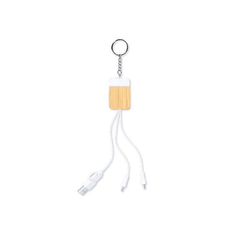 Ladekabel mit Schlüsselring, hergestellt aus Bambus mit Marmorextrakt-Einsatz. Einschließlich USB- und Typ-C-Eingangsanschlüssen mit Lightning-, Micro-USB- und Typ-C-5-VDC-2,4-A-Ausgängen. Präsentiert in einer individuellen Kraft-Design-Tasche. (natürlich farbe)
