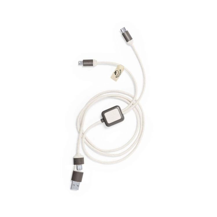Ladekabel aus Kaffeefasern, mit Kabeln aus recycelter Baumwolle. Typ-C- und USB-Eingangsanschlüsse, mit Typ-C-, Lightning- und Micro-USB-Ausgängen. 5V DC 2,4A. Mit Aufklebern aus Kaffeefasern und recycelter Baumwolle. Präsentiert in einer individuellen, selbstverschließenden Kraft-Design-Tasche.Kaffeefasern sind eine kreislauffähige Lösung, die aus der Verwendung der bei der Kaffeeproduktion anfallenden Abfälle gewonnen wird. Eine nachhaltige Alternative, die den Einsatz von Kunststoffen reduziert, Energie im Herstellungsprozess spart und zum Umweltschutz beiträgt. Es gibt eine GRS-Zertifizierung (Global Recycled Standard), die die recycelte Herkunft des für die Herstellung des Produkts verwendeten Materials garantiert. (braun farbe)