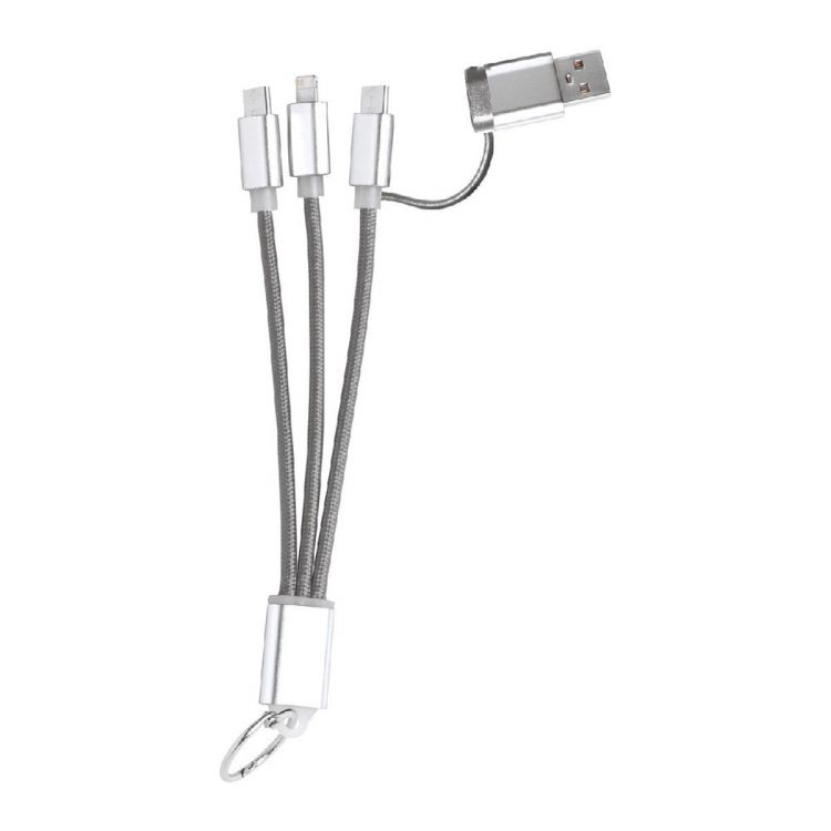 Ladekabel-Schlüsselanhänger aus Aluminium mit Metallring. mit Micro-USB-, USB-C- und Lightning Anschlüssen. Mit USB- und USB-C-Eingängen.