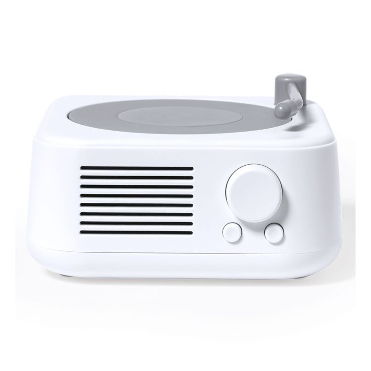 Bluetooth®-Lautsprecher in Form eines originellen Plattenspielers, kompakt und mit 5 W Leistung. 800-mAh-Lithium-Akku, inklusive Typ-C-Ladekabel und Ladestatusanzeige. Freisprechfunktion und FM-Radio, mit Steckplatz für Micro-SD-Karten mit bis zu 32 GB Kapazität und einem AUX-Eingang für 3,5-mm-Klinkenanschluss. Hergestellt aus widerstandsfähigem weißem ABS mit grauen Details und präsentiert in einer individuellen Kraft-Design-Box, mit Bedienungsanleitung in Englisch und Spanisch. (weiß farbe)