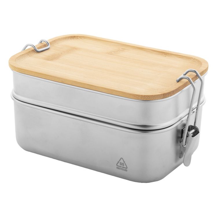 Lunchbox aus recyceltem Edelstahl mit Bambusdeckel und Sicherheits-Schnallenverschluss und 2 Behältern von 340 und 600 ml