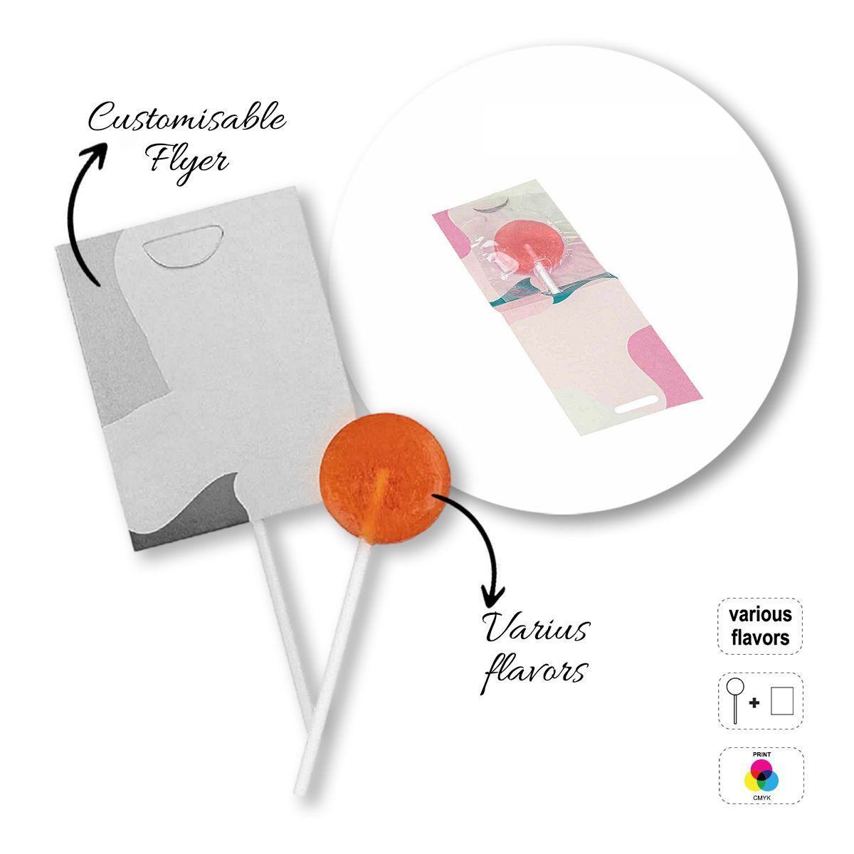 Runder, flacher Lutscher mit 7g-Flyer. Die Buchstaben im Produktcode entsprechen der Form des Flyers: A- rechteckig, B- klein. Gemischte Geschmacksrichtungen: Erdbeere, Apfel, Orange und Zitrone. Verpackt in 100% kompostierbarer, transparenter Folie. Individuell gestaltbarer Flyer aus 100 % biologisch abbaubarem Papier (Papierausführung: weiß oder Kraft, bei der Bestellung zu wählen). Stick aus Papier. Mindesthaltbarkeit - 12 Monate.