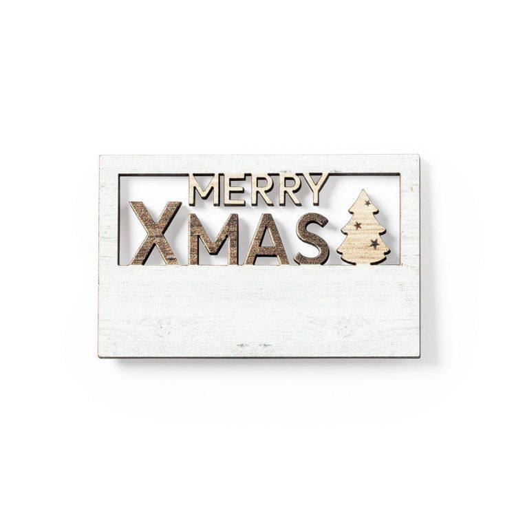 Echter Frohe-Weihnachten-Magnet aus Naturholz, mit gestanztem Text und Original-Bicolor-Finish. Große Brandingfläche und Made in Europe-Logo. (natürlich farbe)