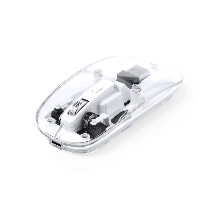 Drahtlose optische Maus in einem originellen Design, mit einer transparenten Darstellung der internen Komponenten des Geräts. Eingebauter 300 mAh Akku und Typ C Ladeanschluss (Kabel im Lieferumfang enthalten). Inklusive DPI-Taste, mit Plug-and-Play-USB-Anschluss und präsentiert in einer individuellen Kraft-Design-Box. (weiß farbe)