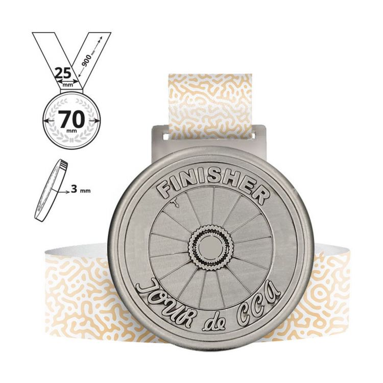 Runde Medaille mit vollständig anpassbarem 25 x 900 mm langem Schlüsselband. Die Medaille wird mit einer 3D-Effektform hergestellt, die speziell nach dem Projekt des Kunden erstellt wurde. Dank dieses Prozesses können wir ein einzigartiges und dreidimensionales Produkt erhalten, das in die Form gegossen wird. Die Medaillen sind in drei Farben zum gleichen Preis erhältlich (Gold, Silber und Bronze).