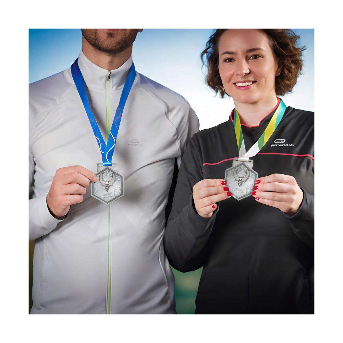 Sechseckige Medaille mit vollständig anpassbarem 20x900-mm-Umhängeband. Die Medaille wird mit einer 3D-Effektform hergestellt, die speziell nach dem Projekt des Kunden erstellt wurde. Dank dieses Prozesses können wir ein einzigartiges und dreidimensionales Produkt erhalten, das in die Form gegossen wird. Die Medaillen sind in drei Farben zum gleichen Preis erhältlich (Gold, Silber und Bronze).