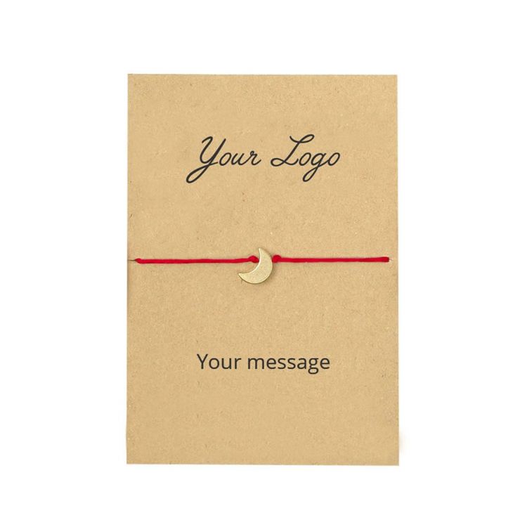 Farbiges Armband aus dünnem Seil und Metallanhänger (nickelfrei). Das Armband wird zusammen mit einer recycelten Karte geliefert, die auf einer Seite mit Ihrer eigenen Kommunikationsbotschaft personalisiert werden kann. Einzeln verpackt im transparenten Polybeutel.
