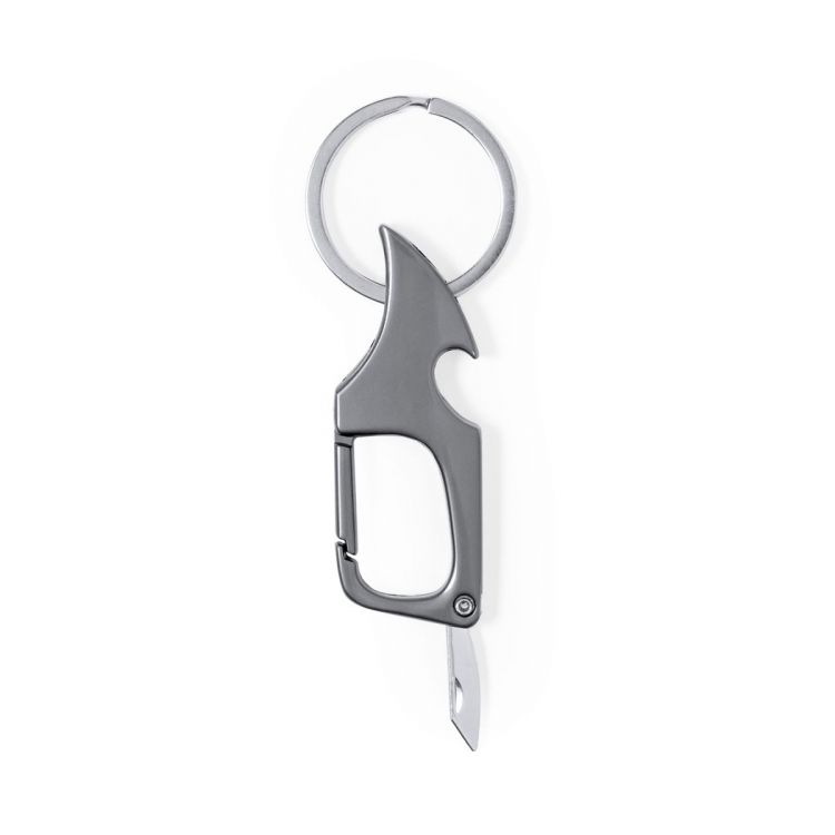 Praktischer Metallöffner mit Schlüsselring und Karabiner zur schnellen Befestigung. Mit Flaschenöffner an einem Ende und einem kleinen Edelstahlmesser am anderen Ende, ideal zum Öffnen von Briefen, Paketen ... In einer eleganten metallischen schwarzen Farbe und präsentiert in einer recycelten Papiertüte. (silber farbe)