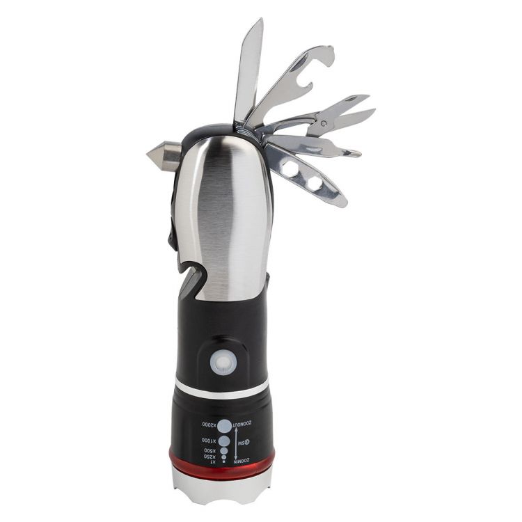 Multifunktions-Taschenlampe aus ABS und Edelstahl mit Nothammer, Gurtschneider und Multitool mit 9 Funktionen. Mit zoombarem LED-Licht und 3 Lichtmodi. Exkl. Batterien (3x AAA)