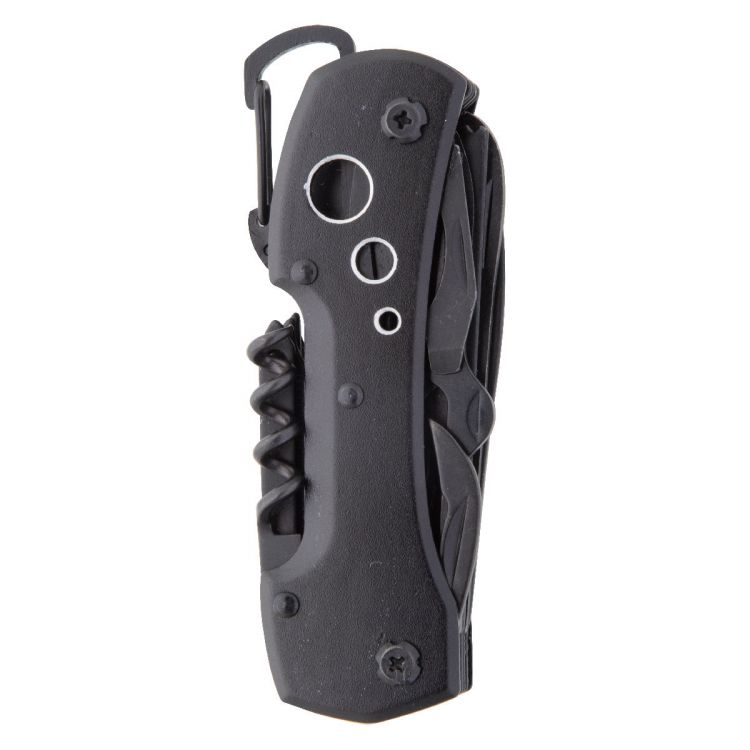 Komplett schwarzes Edelstahl-Taschenmesser mit 13 Funktionen, Aluminium-Griffen und Karabiner, in schwarz farbe