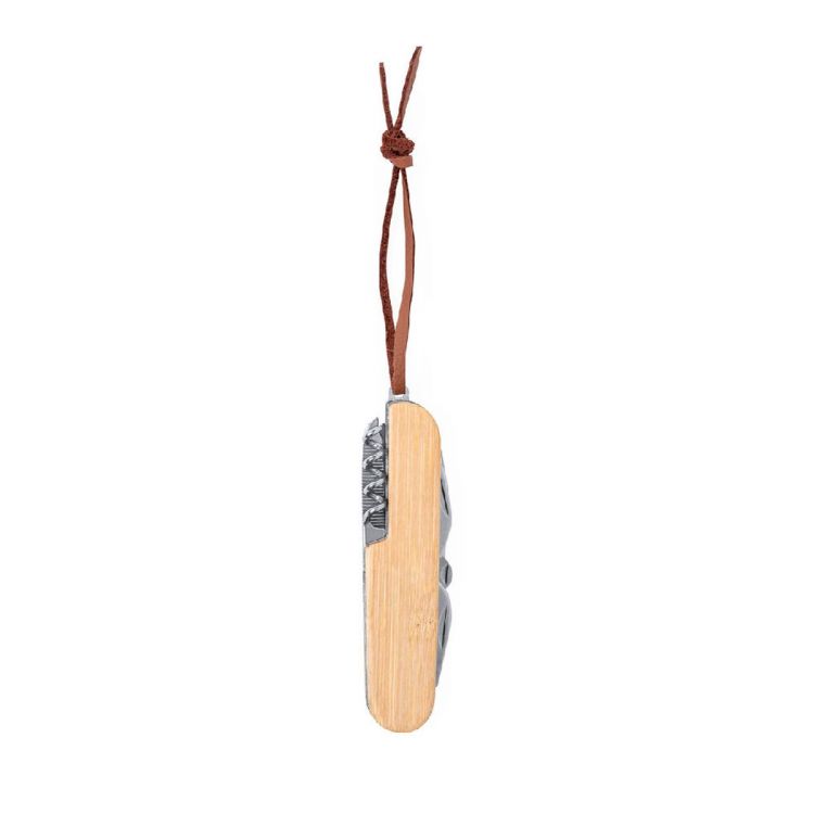 Taschenmesser aus Edelstahl mit Bambusgriff und 9 Funktionen. Mit Band aus Kunstleder