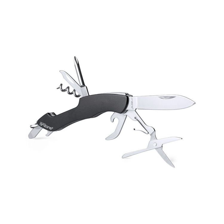 Vielseitig verwendbares Taschenmesser von Orizons mit 10 Edelstahl-Funktionen und Aluminiumgriff in lebendigen Farben. Mit Messer, Schere, Dosenöffner, Flaschenöffner mit Schlitzschraubendreher, Kreuzschraubendreher, Schlagdorn mit Feile und Korkenzieher. Mit Schlüsselring. Präsentiert in einer attraktiven Designbox mit dem Markenlogo.