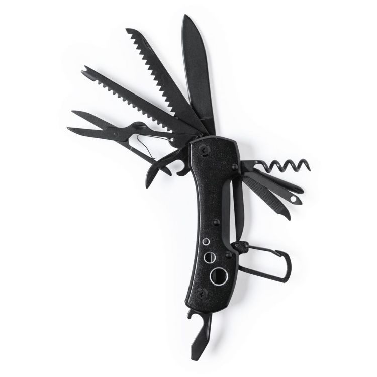 Mehrzweckmesser mit Zubehör aus rostfreiem Stahl mit schwarzem Finish. Dazu passender, widerstandsfähiger Aluminiumgriff mit integriertem Karabiner. 13 Funktionen, darunter Messer, Schraubendreher, Feile, Öffner und Schere. Zusammenklappbar und kompakt in der Größe, präsentiert in einer individuellen Box in schwarzem Design. (schwarz farbe)